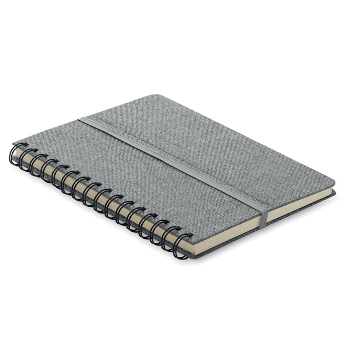 A5 jegyzetfüzet 600D RPET keménytáblás borítóval, okostelefon állvány funkcióval. Spirálozott. 160 vonalas oldal (80 lap). 70 g/m² újrahasznosított papír. Elasztikus zárópánt.